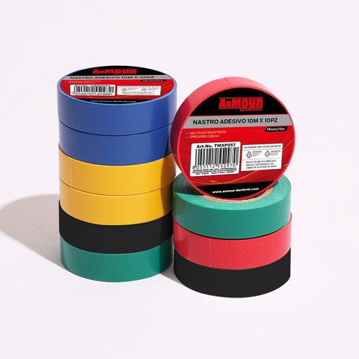 Confezione da 10Pezzi NASTRO ADESIVO COLORATO Misura 10 Metri cad. Spessore:18mm Set colori assortiti Utilizzato per l'isolamento elettrico e...