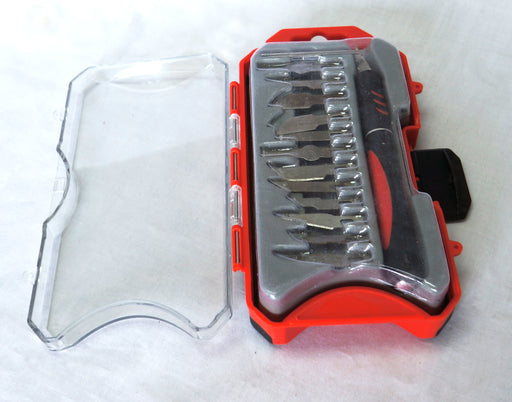 COLTELLO IN CUSTODIA PLASTICA CON 13 LAMESupporto lame rivestita in gomma 13 Lame incisione legno in comodo cofanetto