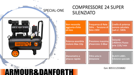 SPECIAL-ONE COMPRESSORE ULTRA-SILENZIATO SENZA OLIOAttacco Rapido con manometro singoloMassima pressione d'esercizio 8bar Leggero, compatto e super...